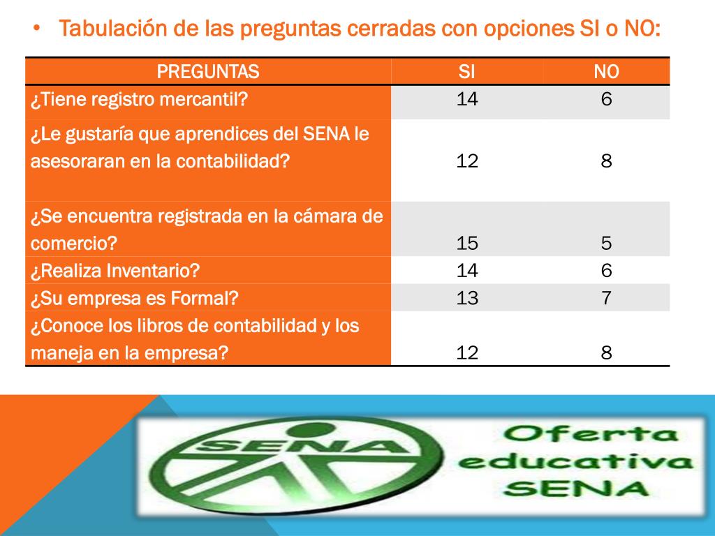 ENCUESTAS • En las encuestas que fueron realizadas en los barrios Ciudad Córdoba y Reservados Córdoba, pudimos observar que en estos sectores se encuentran muchos tipos de negocios como Droguerías, misceláneas, panaderías, graneros, gimnasios, etc. • Resultados de las preguntas cerradas y abiertas, realizadas en cada una de las empresas encuestadas: