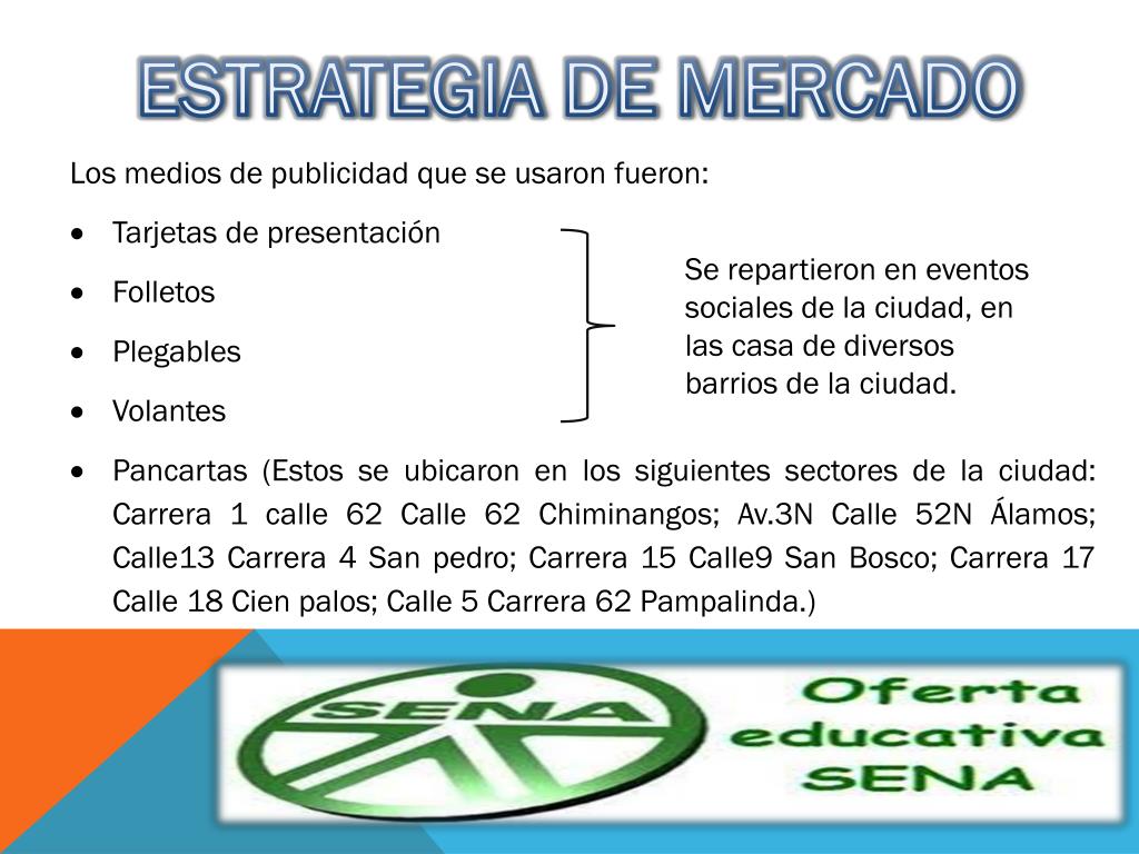 ESTRATEGIA DE MERCADO • Los medios de publicidad que se usaron fueron: • Tarjetas de presentación • Folletos • Plegables • Volantes • Pancartas (Estos se ubicaron en los siguientes sectores de la ciudad: Carrera 1 calle 62 Calle 62 Chiminangos; Av.3N Calle 52N Álamos; Calle13 Carrera 4 San pedro; Carrera 15 Calle9 San Bosco; Carrera 17 Calle 18 Cien palos; Calle 5 Carrera 62 Pampalinda.) Se repartieron en eventos sociales de la ciudad, en las casa de diversos barrios de la ciudad.
