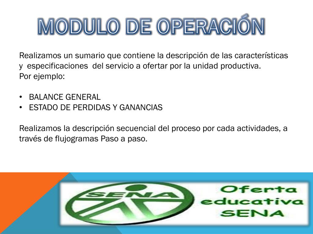 MODULO DE OPERACIÓN • Realizamos un sumario que contiene la descripción de las características y especificaciones del servicio a ofertar por la unidad productiva. • Por ejemplo: • BALANCE GENERAL • ESTADO DE PERDIDAS Y GANANCIAS • Realizamos la descripción secuencial del proceso por cada actividades, a través de flujogramasPaso a paso.
