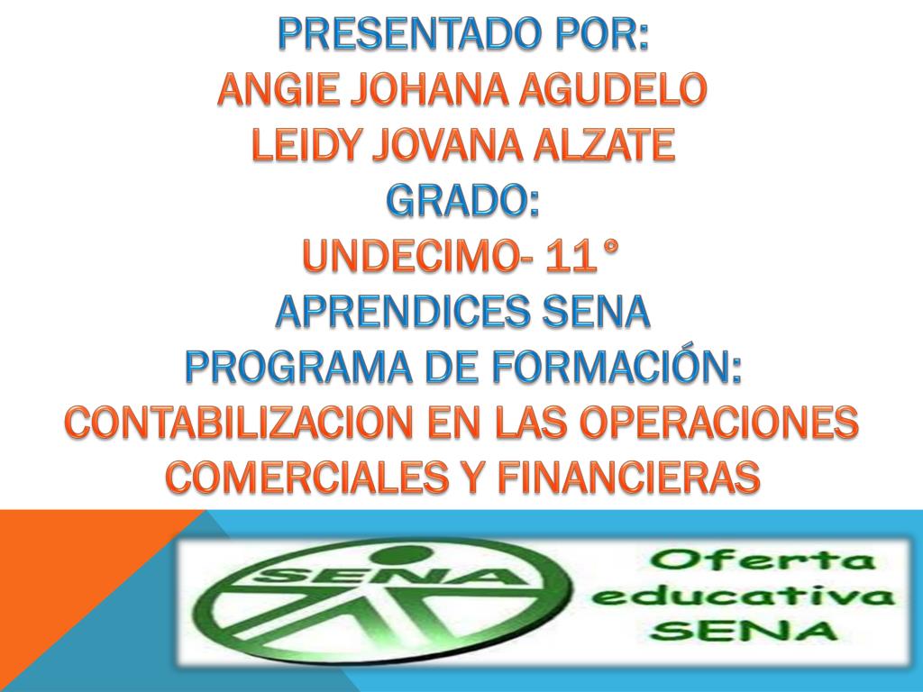 PRESENTADO POR: ANGIE JOHANA AGUDELO LEIDY JOVANA ALZATE GRADO: UNDECIMO- 11° APRENDICES SENA PROGRAMA DE FORMACIÓN: CONTABILIZACION EN LAS OPERACIONES COMERCIALES Y FINANCIERAS