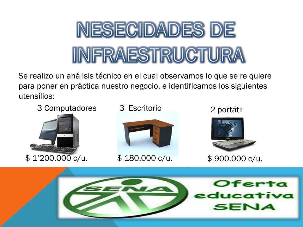 NESECIDADES DE INFRAESTRUCTURA Se realizo un análisis técnico en el cual observamos lo que se re quiere para poner en práctica nuestro negocio, e identificamos los siguientes utensilios: 3 Computadores 3 Escritorio 2 portátil $ 1’200.000 c/u. $ 180.000 c/u. $ 900.000 c/u.