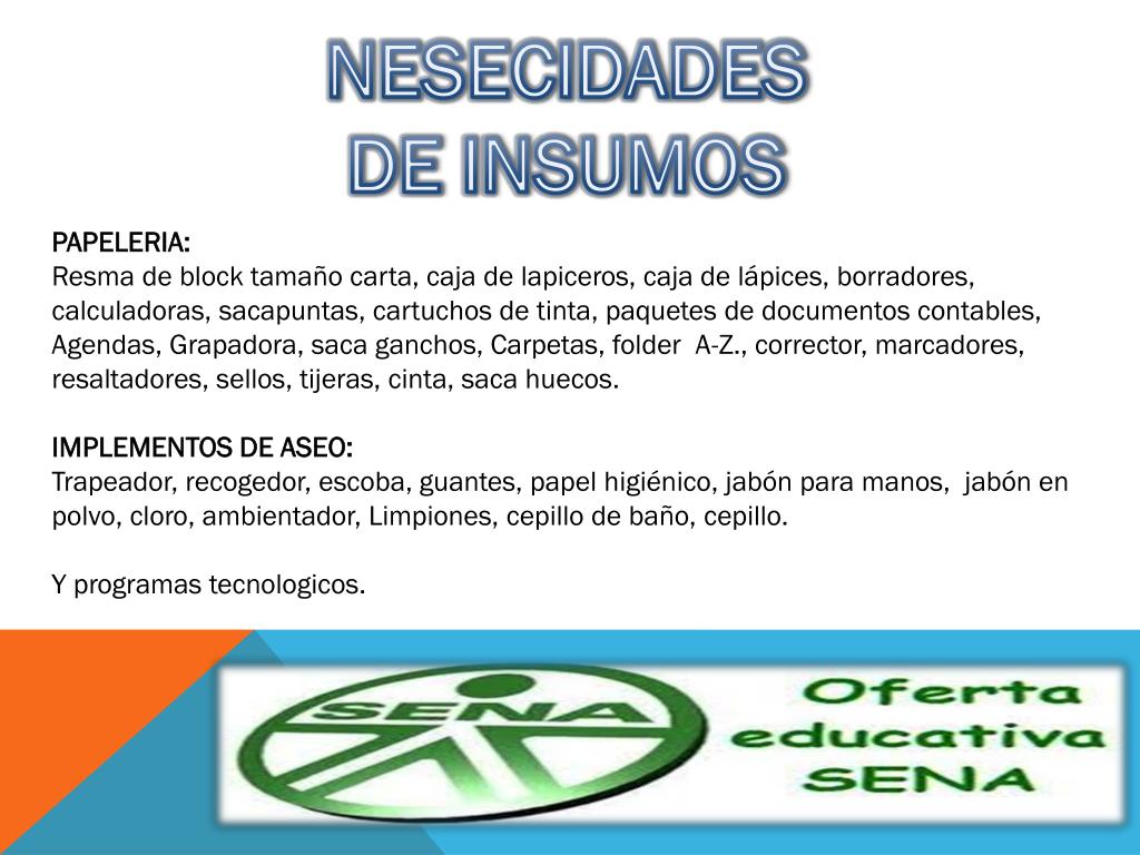 NESECIDADES DE INSUMOS PAPELERIA: Resma de block tamaño carta, caja de lapiceros, caja de lápices, borradores, calculadoras, sacapuntas, cartuchos de tinta, paquetes de documentos contables, Agendas, Grapadora, saca ganchos, Carpetas, folder A-Z., corrector, marcadores, resaltadores, sellos, tijeras, cinta, saca huecos. IMPLEMENTOS DE ASEO: Trapeador, recogedor, escoba, guantes, papel higiénico, jabón para manos, jabón en polvo, cloro, ambientador, Limpiones, cepillo de baño, cepillo. Y programastecnologicos.