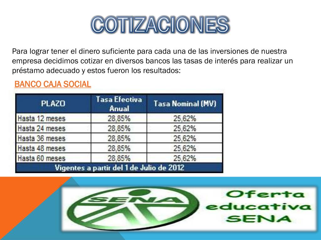 COTIZACIONES Para lograr tener el dinero suficiente para cada una de las inversiones de nuestra empresa decidimos cotizar en diversos bancos las tasas de interés para realizar un préstamo adecuado y estos fueron los resultados: BANCO CAJA SOCIAL