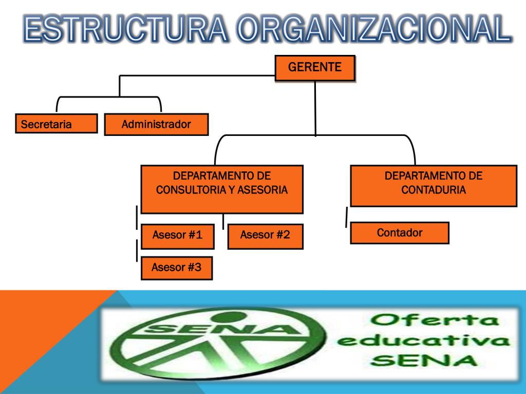ESTRUCTURA ORGANIZACIONAL GERENTE Administrador Secretaria DEPARTAMENTO DE CONSULTORIA Y ASESORIA DEPARTAMENTO DE CONTADURIA Contador Asesor #2 Asesor #1 Asesor #3
