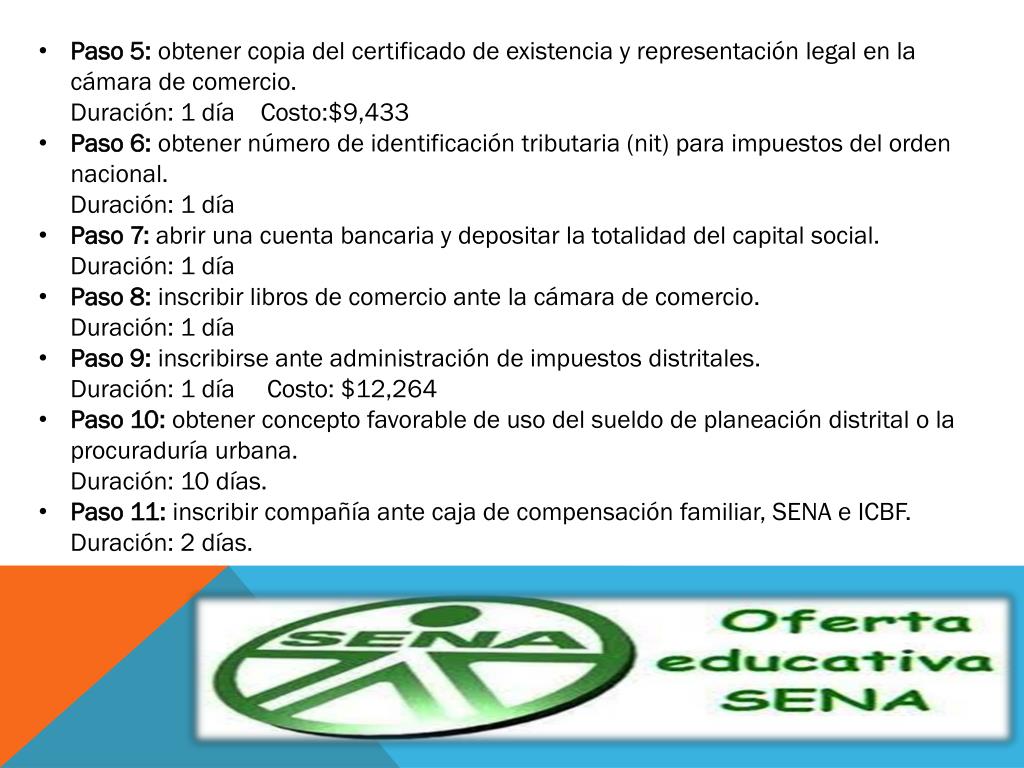 Paso 5: obtener copia del certificado de existencia y representación legal en la cámara de comercio. • Duración: 1 díaCosto:$9,433 • Paso 6: obtener número de identificación tributaria (nit) para impuestos del orden nacional. • Duración: 1 día • Paso 7: abrir una cuenta bancaria y depositar la totalidad del capital social. • Duración: 1 día • Paso 8: inscribir libros de comercio ante la cámara de comercio. • Duración: 1 día • Paso 9: inscribirse ante administración de impuestos distritales. • Duración: 1 díaCosto: $12,264 • Paso 10: obtener concepto favorable de uso del sueldo de planeación distrital o la procuraduría urbana. • Duración: 10 días. • Paso 11: inscribir compañía ante caja de compensación familiar, SENA e ICBF. • Duración: 2 días.