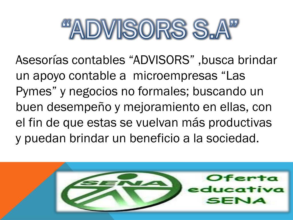 “ADVISORS S.A” Asesorías contables “ADVISORS” ,busca brindar un apoyo contable a microempresas “Las Pymes” y negocios no formales; buscando un buen desempeño y mejoramiento en ellas, con el fin de que estas se vuelvan más productivas y puedan brindar un beneficio a la sociedad.