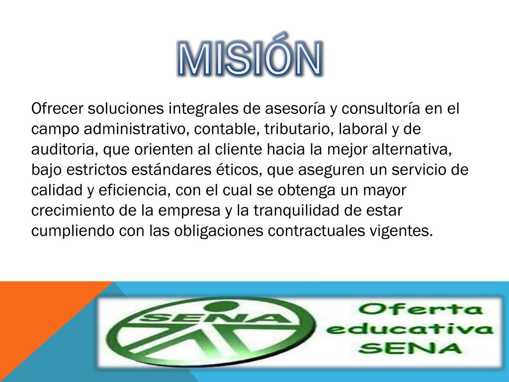 MISIÓN Ofrecer soluciones integrales de asesoría y consultoría en el campo administrativo, contable, tributario, laboral y de auditoria, que orienten al cliente hacia la mejor alternativa, bajo estrictos estándares éticos, que aseguren un servicio de calidad y eficiencia, con el cual se obtenga un mayor crecimiento de la empresa y la tranquilidad de estar cumpliendo con las obligaciones contractuales vigentes.
