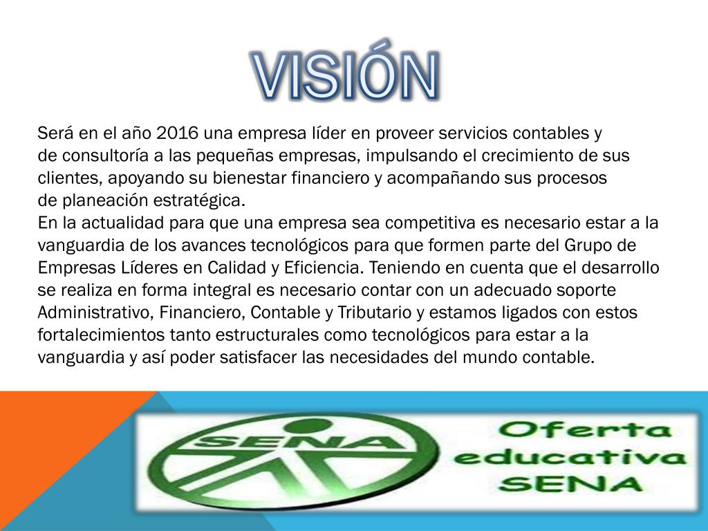 VISIÓN Será en el año 2016 una empresa líder en proveer servicios contables y de consultoría a las pequeñas empresas, impulsando el crecimiento de sus clientes, apoyando su bienestar financiero y acompañando sus procesos de planeación estratégica. En la actualidad para que una empresa sea competitiva es necesario estar a la vanguardia de los avances tecnológicos para que formen parte del Grupo de Empresas Líderes en Calidad y Eficiencia. Teniendo en cuenta que el desarrollo se realiza en forma integral es necesario contar con un adecuado soporte Administrativo, Financiero, Contable y Tributario y estamos ligados con estos fortalecimientos tanto estructurales como tecnológicos para estar a la vanguardia y así poder satisfacer las necesidades del mundo contable.