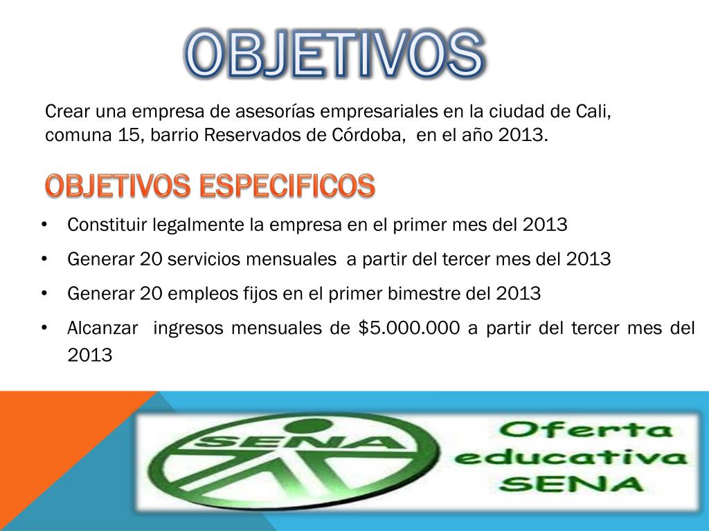 OBJETIVOS Crear una empresa de asesorías empresariales en la ciudad de Cali, comuna 15, barrio Reservados de Córdoba, en el año 2013. OBJETIVOS ESPECIFICOS