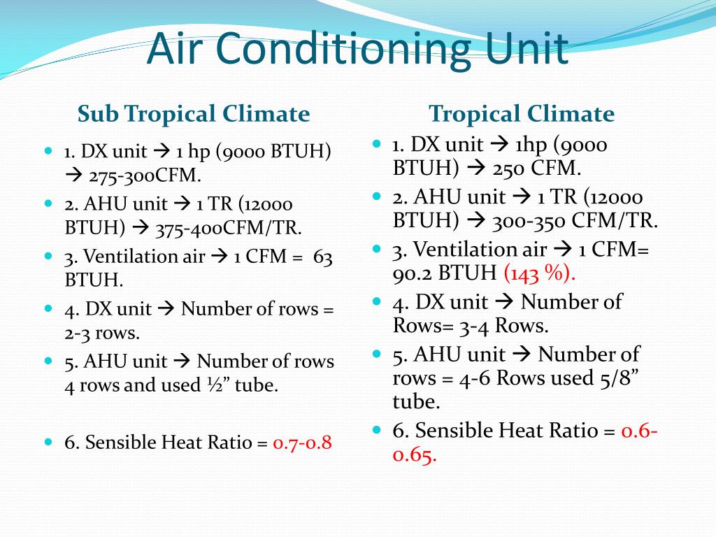 Air Conditioning Unit Sub Tropical Climate Tropical Climate • 1. DX unit 1 hp (9000 BTUH) 275-300CFM. • 2. AHU unit 1 TR (12000 BTUH) 375-400CFM/TR. • 3. Ventilation air 1 CFM = 63 BTUH. • 4. DX unit Number of rows = 2-3 rows. • 5. AHU unit Number of rows 4 rows and used ½” tube. • 6. Sensible Heat Ratio = 0.7-0.8 • 1. DX unit 1hp (9000 BTUH) 250 CFM. • 2. AHU unit 1 TR (12000 BTUH) 300-350 CFM/TR. • 3. Ventilation air 1 CFM= 90.2 BTUH (143 %). • 4. DX unit Number of Rows= 3-4 Rows. • 5. AHU unit Number of rows = 4-6 Rows used 5/8” tube. • 6. Sensible Heat Ratio = 0.6-0.65.