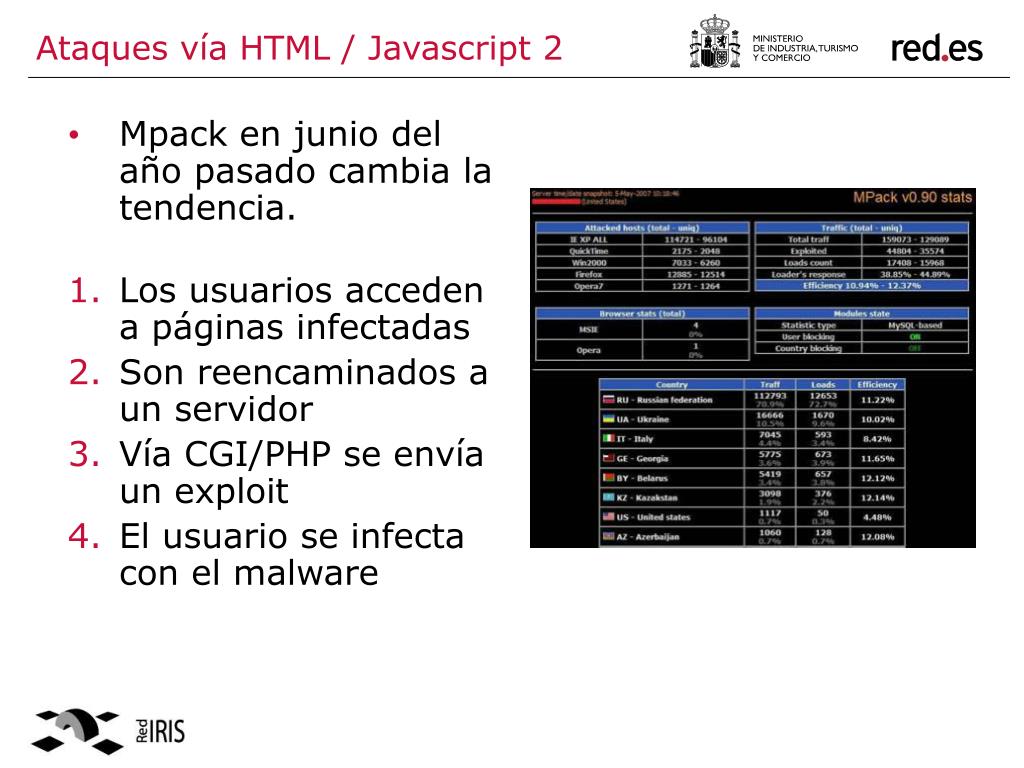 Ataques vía HTML / Javascript 2 • Mpack en junio del año pasado cambia la tendencia. • Los usuarios acceden a páginas infectadas • Son reencaminados a un servidor • Vía CGI/PHP se envía un exploit • El usuario se infecta con el malware