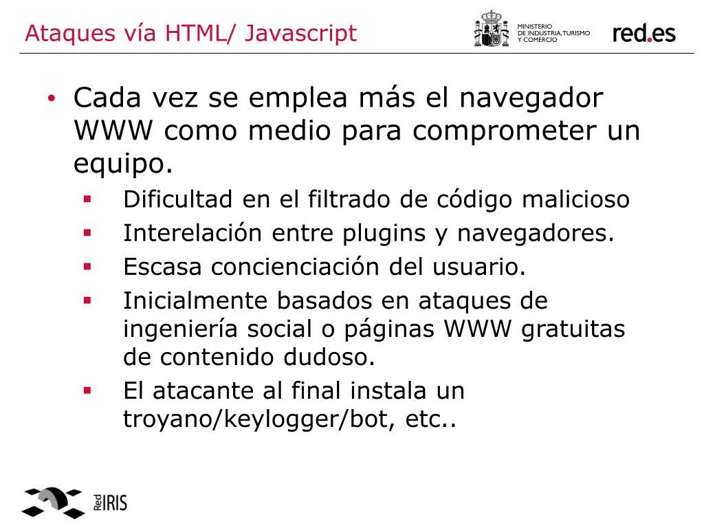Ataques vía HTML/ Javascript • Cada vez se emplea más el navegador WWW como medio para comprometer un equipo. • Dificultad en el filtrado de código malicioso • Interelación entre plugins y navegadores. • Escasa concienciación del usuario. • Inicialmente basados en ataques de ingeniería social o páginas WWW gratuitas de contenido dudoso. • El atacante al final instala un troyano/keylogger/bot, etc..