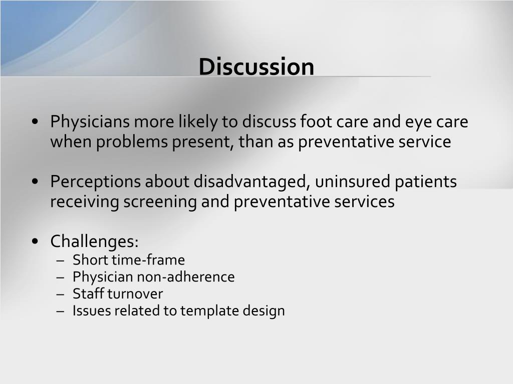 Discussion • Physicians more likely to discuss foot care and eye care when problems present, than as preventative service • Perceptions about disadvantaged, uninsured patients receiving screening and preventative services • Challenges: • Short time-frame • Physician non-adherence • Staff turnover • Issues related to template design