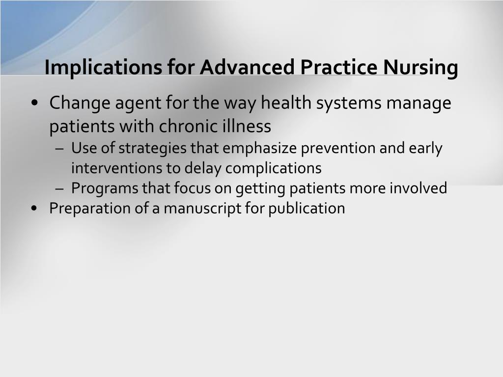 Implications for Advanced Practice Nursing • Change agent for the way health systems manage patients with chronic illness • Use of strategies that emphasize prevention and early interventions to delay complications • Programs that focus on getting patients more involved • Preparation of a manuscript for publication