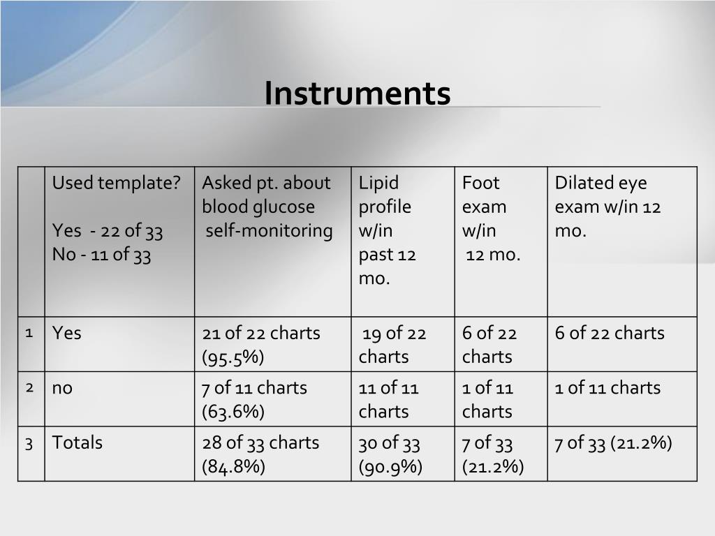 Data Collection and Analysis • Retrospective audit of charts for: • Consistent use of diabetes care templates in EMR • Documentation of asking patients about blood glucose self-monitoring • Documentation of lipid profile within the past year • Documentation of most recent clinical foot exam • Documentation of dilated eye exam within past year