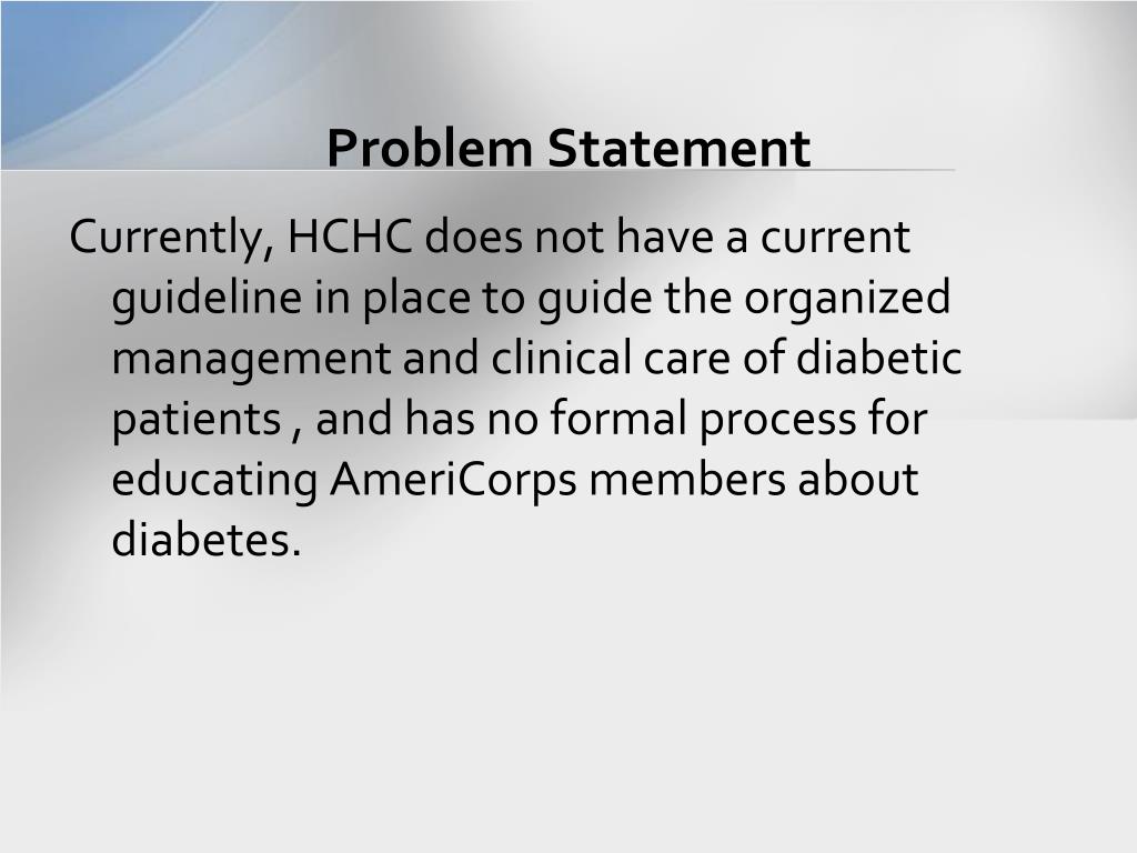 Problem Statement Currently, HCHC does not have a current guideline in place to guide the organized management and clinical care of diabetic patients , and has no formal process for educating AmeriCorps members about diabetes.