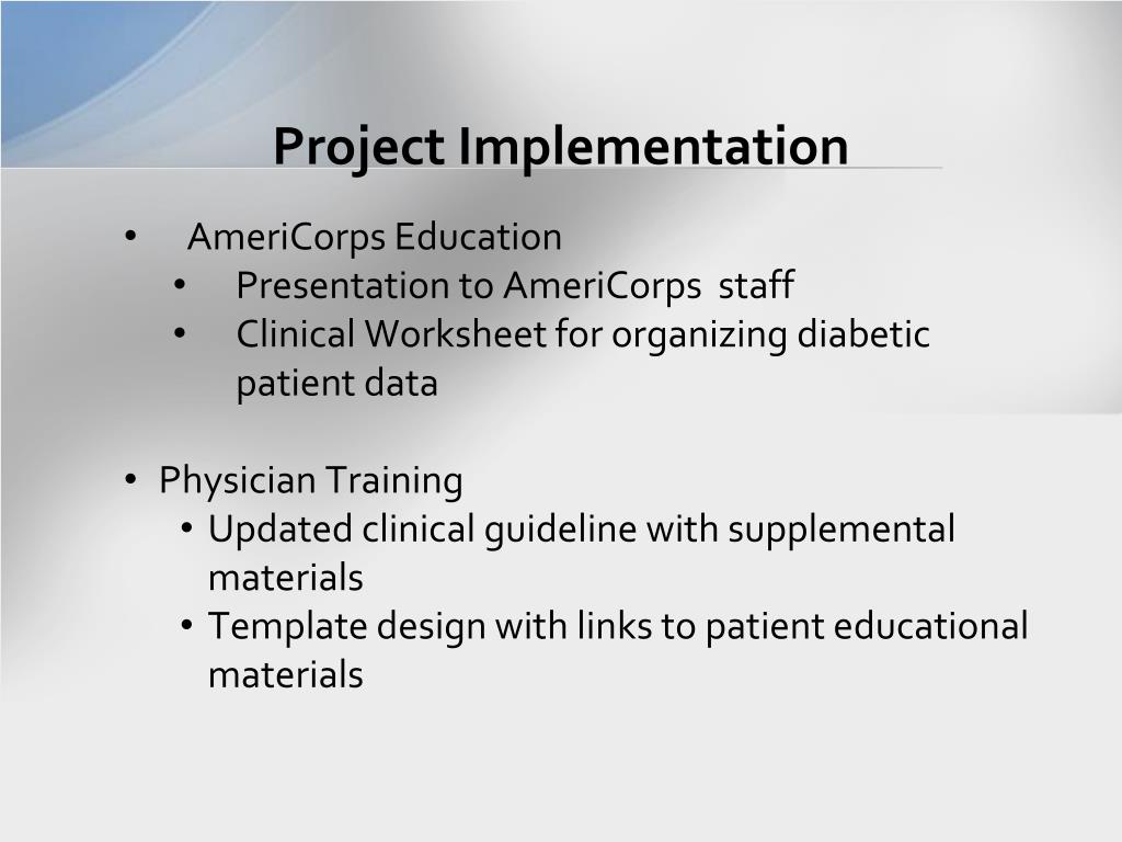Project Implementation • AmeriCorps Education • Presentation to AmeriCorps staff • Clinical Worksheet for organizing diabetic patient data • Physician Training • Updated clinical guideline with supplemental materials • Template design with links to patient educational materials