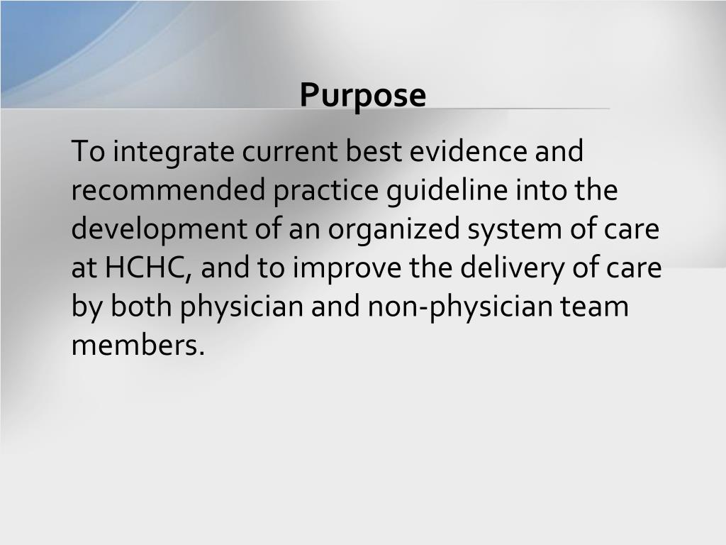 Purpose To integrate current best evidence and recommended practice guideline into the development of an organized system of care at HCHC, and to improve the delivery of care by both physician and non-physician team members.