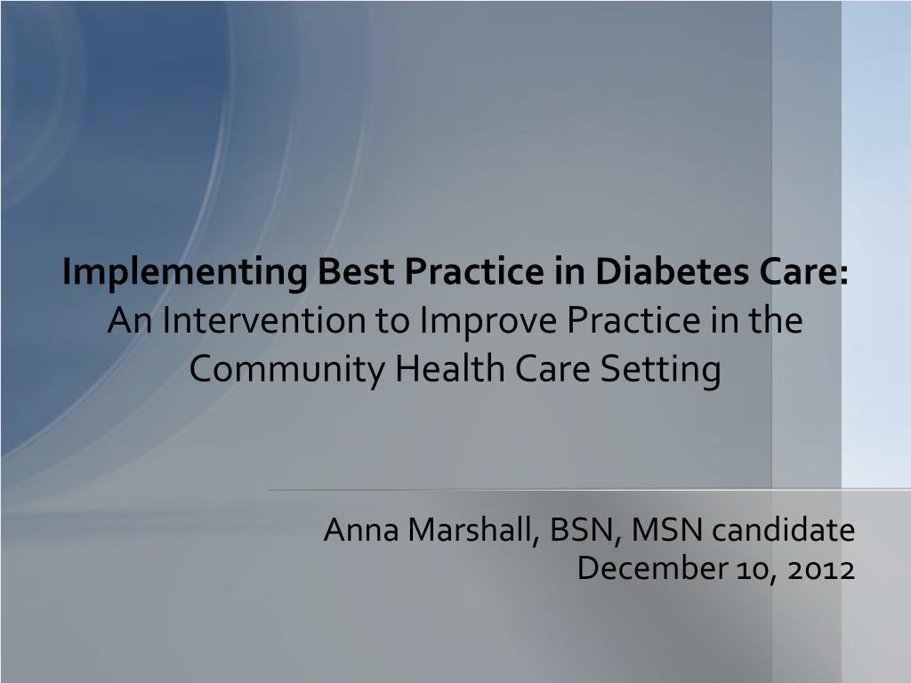 Implementing Best Practice in Diabetes Care: An Intervention to Improve Practice in the Community Health Care Setting Anna Marshall, BSN, MSN candidate December 10, 2012