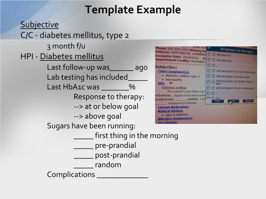 Template Example • Subjective • C/C - diabetes mellitus, type 2 • 3 month f/u • HPI - Diabetes mellitus • Last follow-up was______ ago • Lab testing has included_____ • Last HbA1c was _______% • Response to therapy: • --> at or below goal • --> above goal • Sugars have been running: • _____ first thing in the morning • _____ pre-prandial • _____ post-prandial • _____ random • Complications _____________