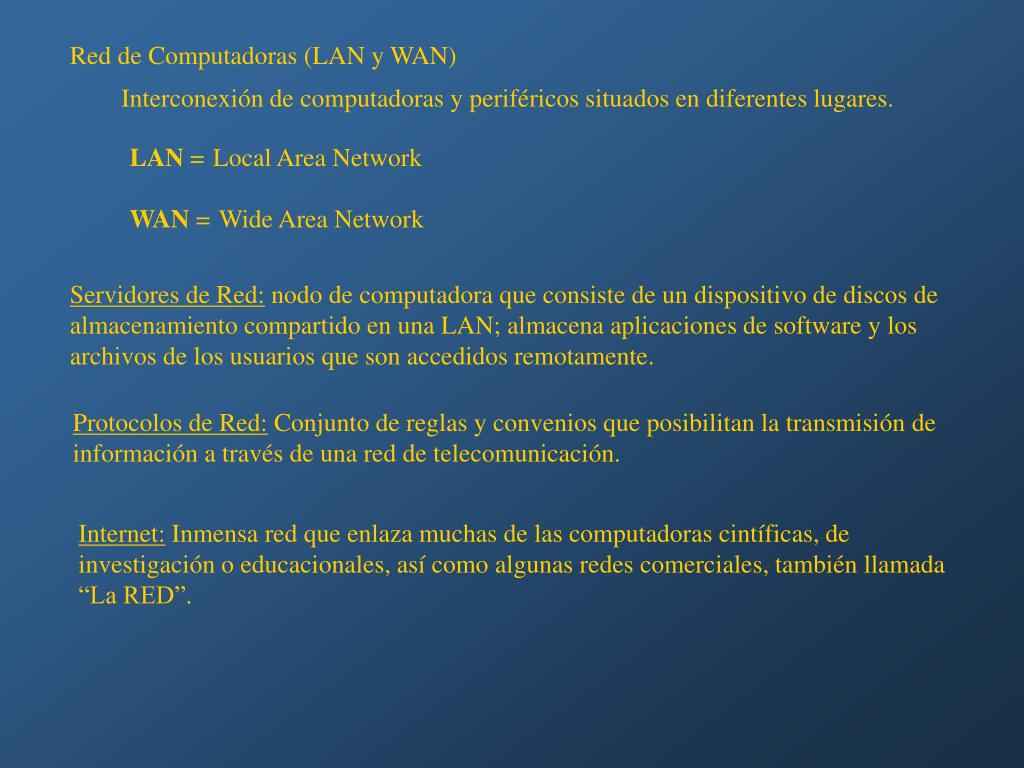 Red de Computadoras (LAN y WAN) Interconexión de computadoras y periféricos situados en diferentes lugares. LAN =Local Area Network WAN =Wide Area Network Servidores de Red: nodo de computadora que consiste de un dispositivo de discos de almacenamiento compartido en una LAN; almacena aplicaciones de software y los archivos de los usuarios que son accedidos remotamente. Protocolos de Red: Conjunto de reglas y convenios que posibilitan la transmisión de información a través de una red de telecomunicación. Internet: Inmensa red que enlaza muchas de las computadoras cintíficas, de investigación o educacionales, así como algunas redes comerciales, también llamada “La RED”.