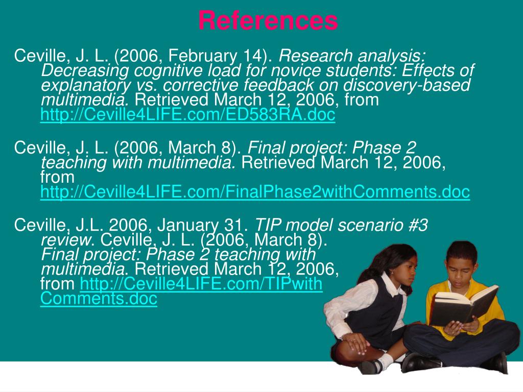 References Ceville, J. L. (2006, February 14). Research analysis: Decreasing cognitive load for novice students: Effects of explanatory vs. corrective feedback on discovery-based multimedia. Retrieved March 12, 2006, from http://Ceville4LIFE.com/ED583RA.doc Ceville, J. L. (2006, March 8). Final project: Phase 2 teaching with multimedia. Retrieved March 12, 2006, from http://Ceville4LIFE.com/FinalPhase2withComments.doc Ceville, J.L. 2006, January 31. TIP model scenario #3 review. Ceville, J. L. (2006, March 8). Final project: Phase 2 teaching with multimedia. Retrieved March 12, 2006, from http://Ceville4LIFE.com/TIPwith Comments.doc
