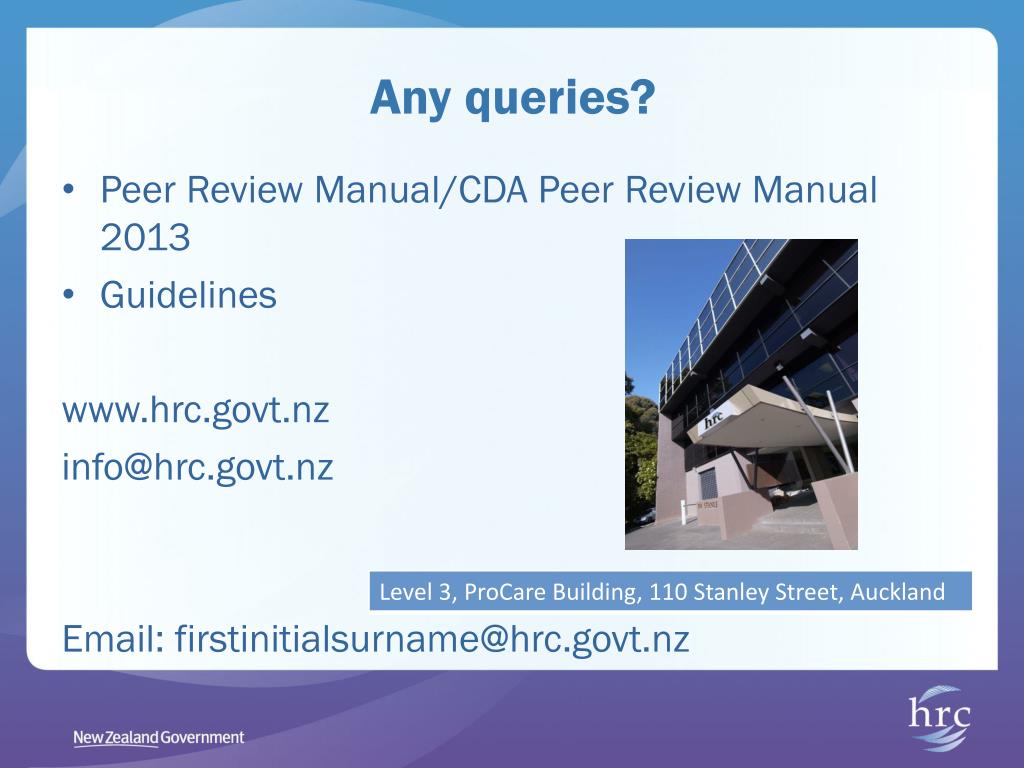 Any queries? • Peer Review Manual/CDA Peer Review Manual 2013 • Guidelines www.hrc.govt.nz info@hrc.govt.nz Email: firstinitialsurname@hrc.govt.nz