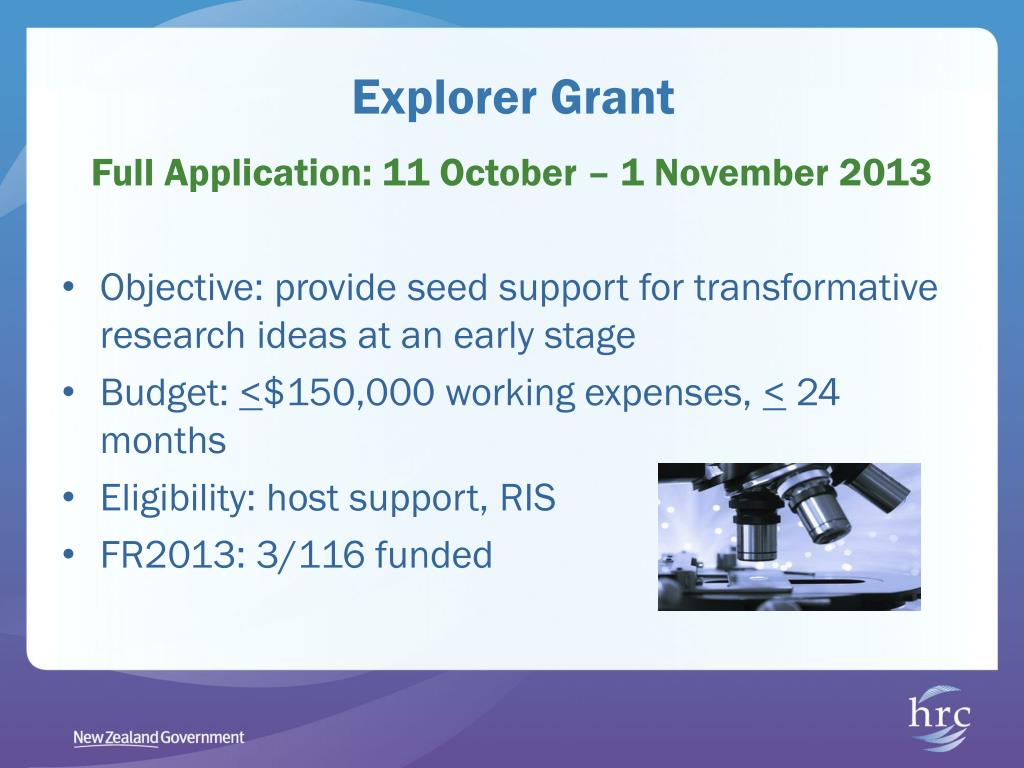 Explorer Grant Full Application: 11 October – 1 November 2013 • Objective: provide seed support for transformative research ideas at an early stage • Budget: <$150,000 working expenses, < 24 months • Eligibility: host support, RIS • FR2013: 3/116 funded