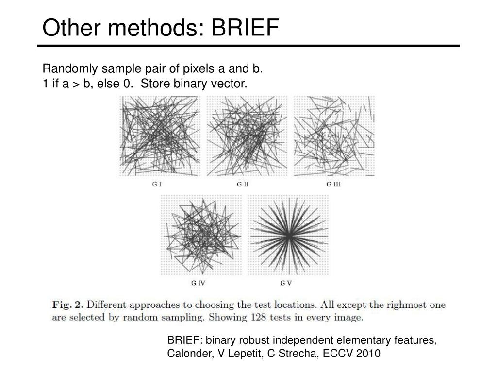 Other methods: BRIEF Randomly sample pair of pixels a and b. 1 if a > b, else 0. Store binary vector. Daisy BRIEF: binary robust independent elementary features, Calonder, V Lepetit, C Strecha, ECCV 2010