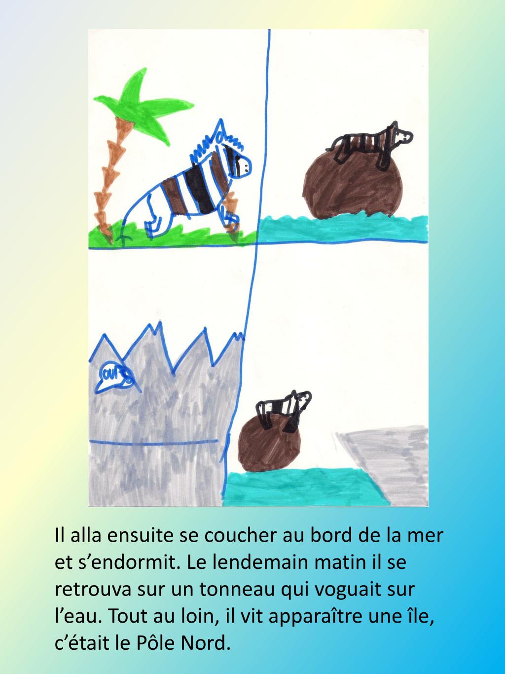 Il alla ensuite se coucher au bord de la mer et s’endormit. Le lendemain matin il se retrouva sur un tonneau qui voguait sur l’eau. Tout au loin, il vit apparaître une île, c’était le Pôle Nord.