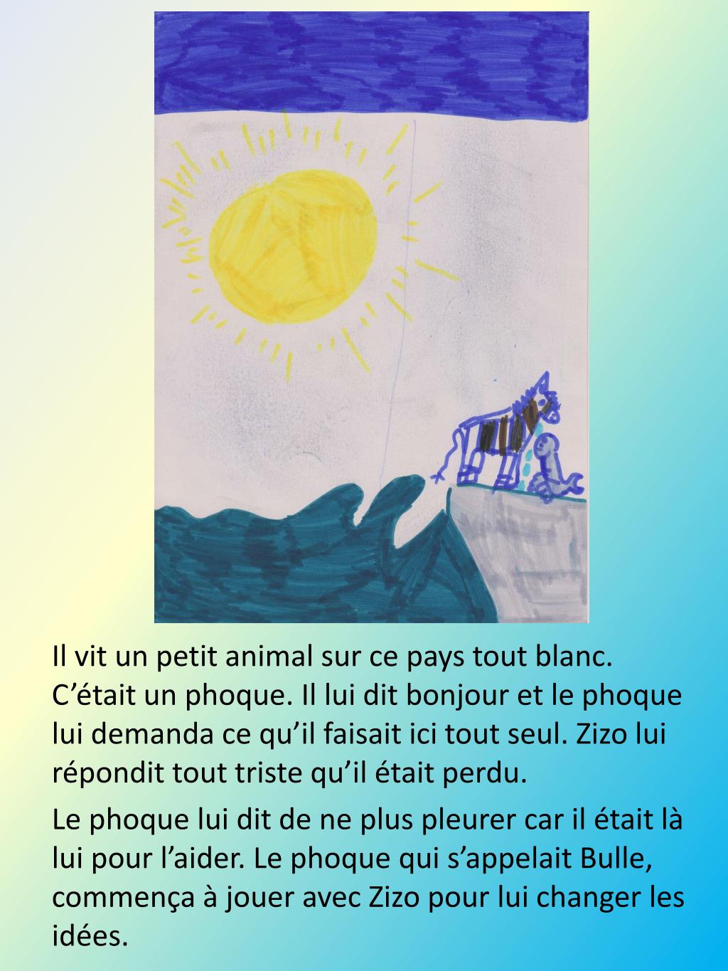Il vit un petit animal sur ce pays tout blanc. C’était un phoque. Il lui dit bonjour et le phoque lui demanda ce qu’il faisait ici tout seul. Zizo lui répondit tout triste qu’il était perdu. Le phoque lui dit de ne plus pleurer car il était là lui pour l’aider. Le phoque qui s’appelait Bulle, commença à jouer avec Zizo pour lui changer les idées.