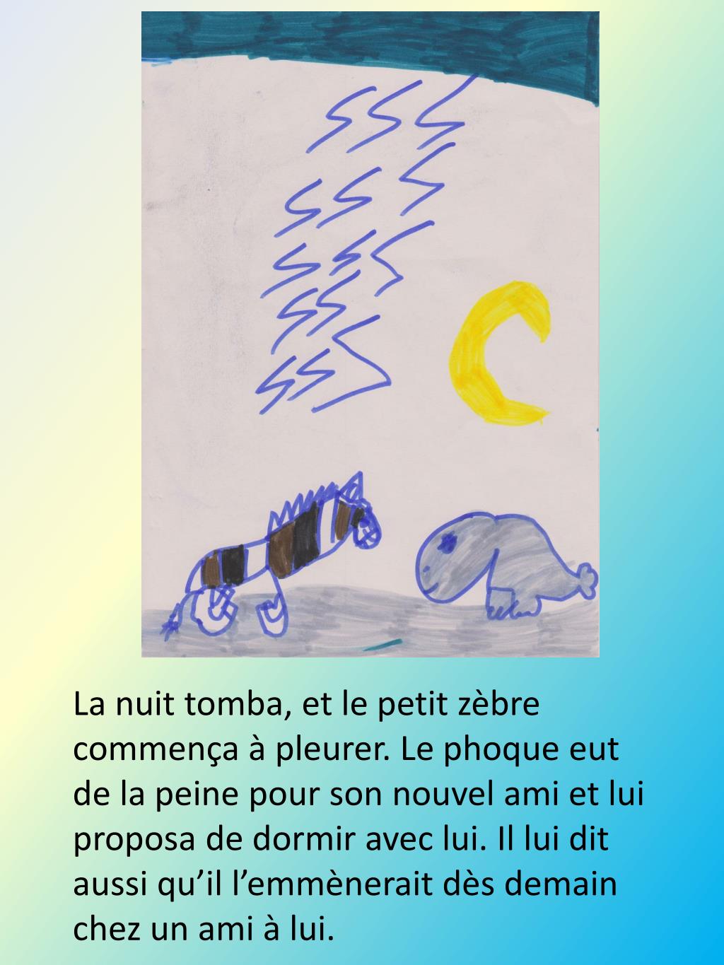 La nuit tomba, et le petit zèbre commença à pleurer. Le phoque eut de la peine pour son nouvel ami et lui proposa de dormir avec lui. Il lui dit aussi qu’il l’emmènerait dès demain chez un ami à lui.