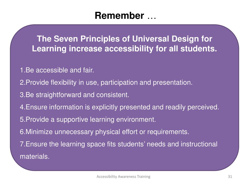 3. Principles of Universal Design for Learning in Action The table below slide demonstrates how the seven principles of Universal Design for Learning can be implemented. Accessibility Awareness Training 30