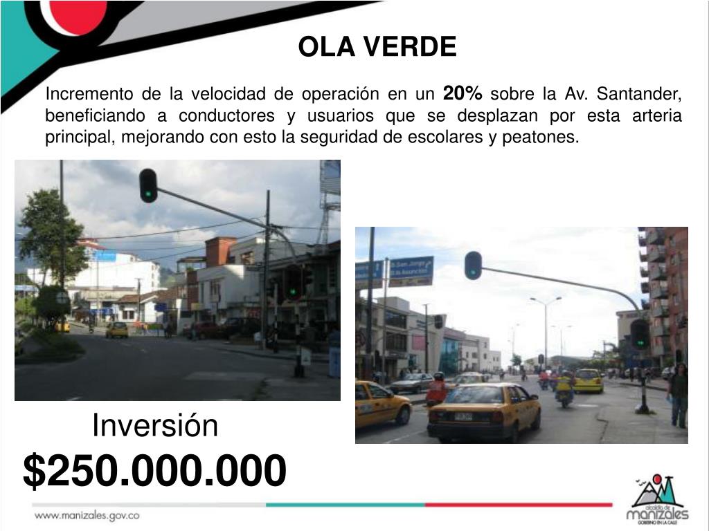 OLA VERDE Incremento de la velocidad de operación en un 20% sobre la Av. Santander, beneficiando a conductores y usuarios que se desplazan por esta arteria principal, mejorando con esto la seguridad de escolares y peatones. Inversión $250.000.000