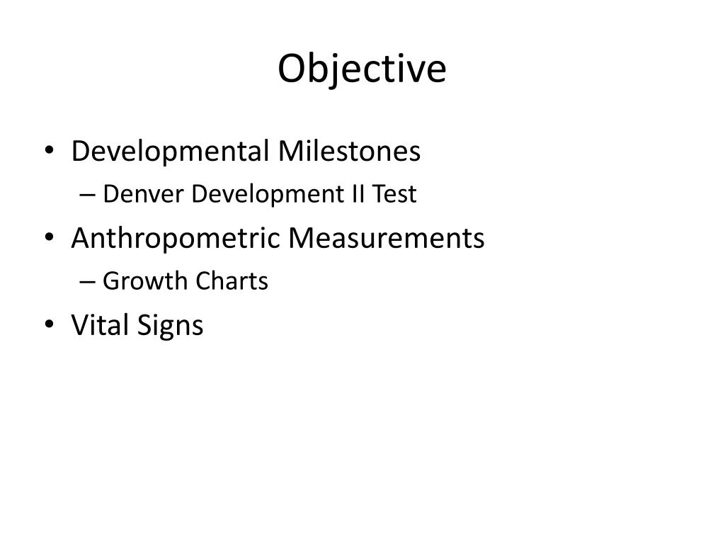 Objective • Developmental Milestones • Denver Development II Test • Anthropometric Measurements • Growth Charts • Vital Signs