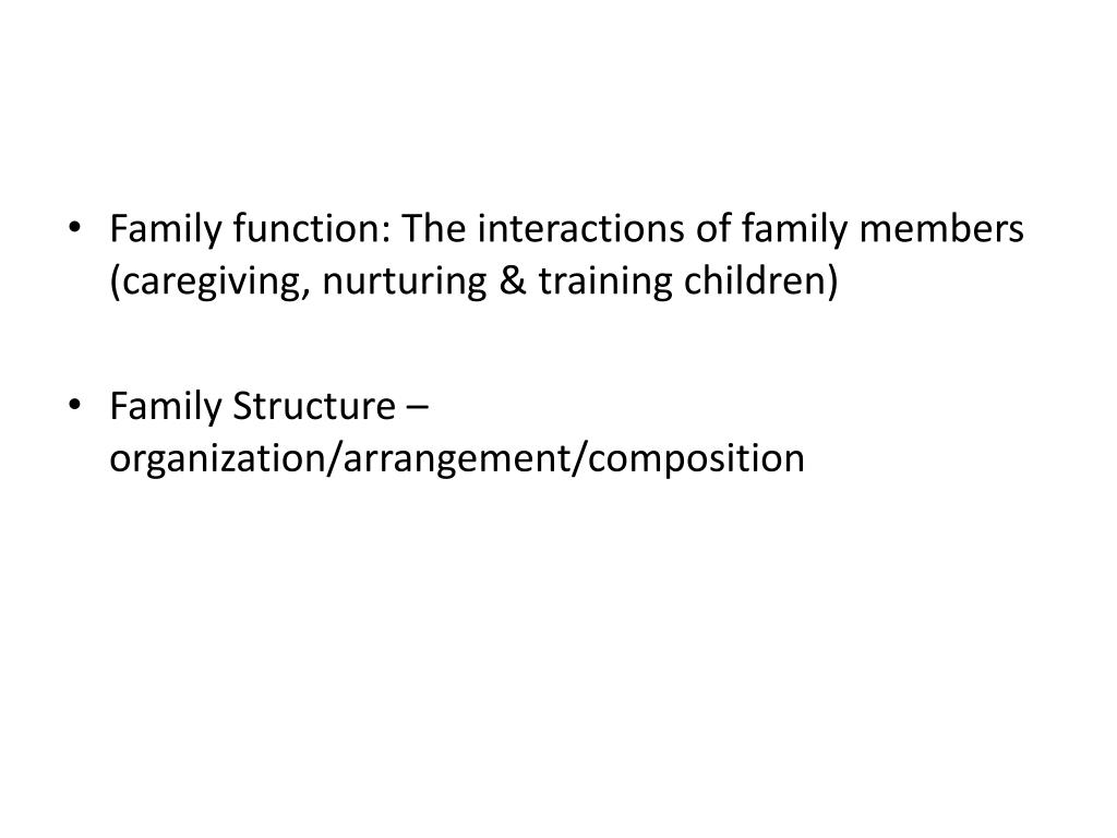 Family function: The interactions of family members (caregiving, nurturing & training children) • Family Structure – organization/arrangement/composition