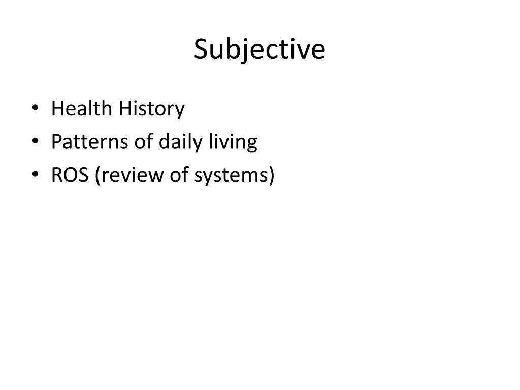 Subjective • Health History • Patterns of daily living • ROS (review of systems)