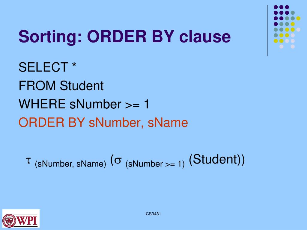 Sorting: ORDER BY clause SELECT * FROM Student WHERE sNumber >= 1 ORDER BY sNumber, sName (sNumber, sName) ( (sNumber >= 1) (Student)) CS3431
