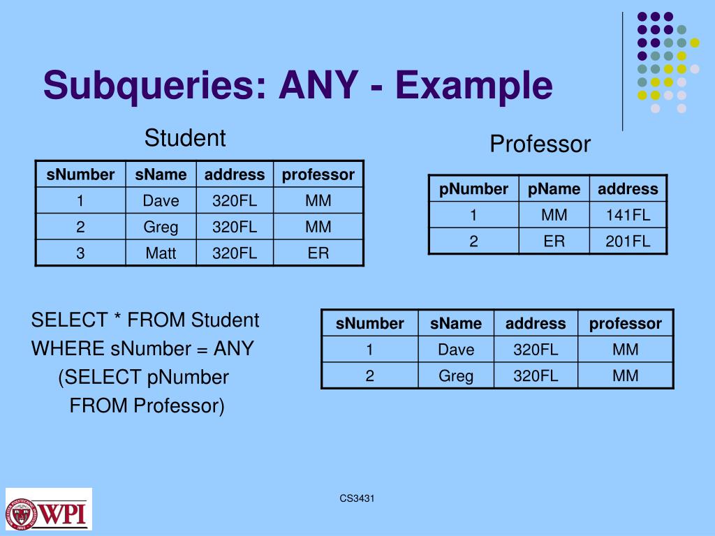 Subqueries: ANY - Example Student Professor SELECT * FROM Student WHERE sNumber = ANY (SELECT pNumber FROM Professor) CS3431