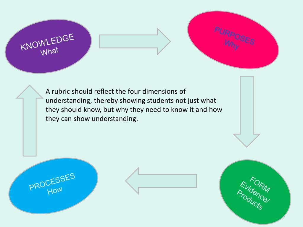PURPOSES Why KNOWLEDGE What A rubric should reflect the four dimensions of understanding, thereby showing students not just what they should know, but why they need to know it and how they can show understanding. PROCESSES How FORM Evidence/ Products 29