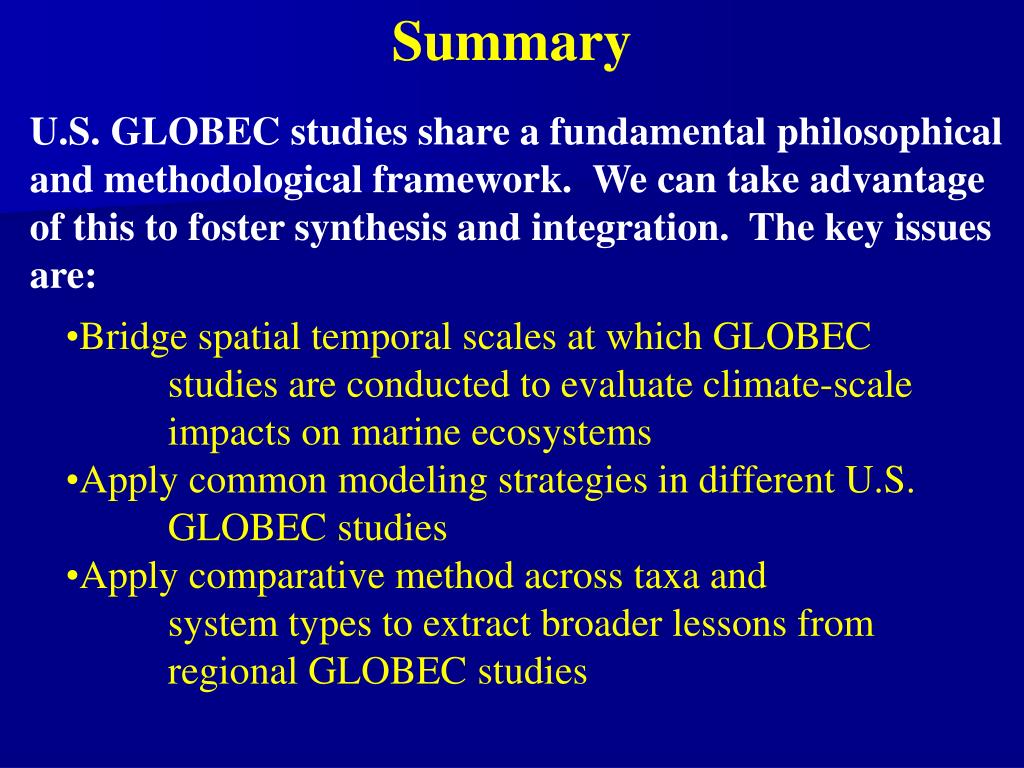 Summary U.S. GLOBEC studies share a fundamental philosophical and methodological framework. We can take advantage of this to foster synthesis and integration. The key issues are: • Bridge spatial temporal scales at which GLOBEC studies are conducted to evaluate climate-scale impacts on marine ecosystems • Apply common modeling strategies in different U.S. GLOBEC studies • Apply comparative method across taxa and • system types to extract broader lessons from regional GLOBEC studies
