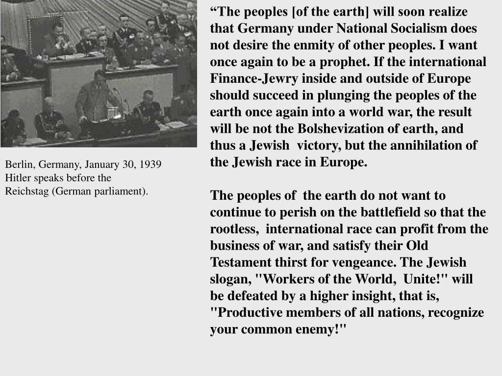 “The peoples [of the earth] will soon realize that Germany under National Socialism does not desire the enmity of other peoples. I want once again to be a prophet. If the international Finance-Jewry inside and outside of Europe should succeed in plunging the peoples of the earth once again into a world war, the result will be not the Bolshevization of earth, and thus a Jewish victory, but the annihilation of the Jewish race in Europe. The peoples of the earth do not want to continue to perish on the battlefield so that the rootless, international race can profit from the business of war, and satisfy their Old Testament thirst for vengeance. The Jewish slogan, "Workers of the World, Unite!" will be defeated by a higher insight, that is, "Productive members of all nations, recognize your common enemy!" Berlin, Germany, January 30, 1939 Hitler speaks before the Reichstag (German parliament).