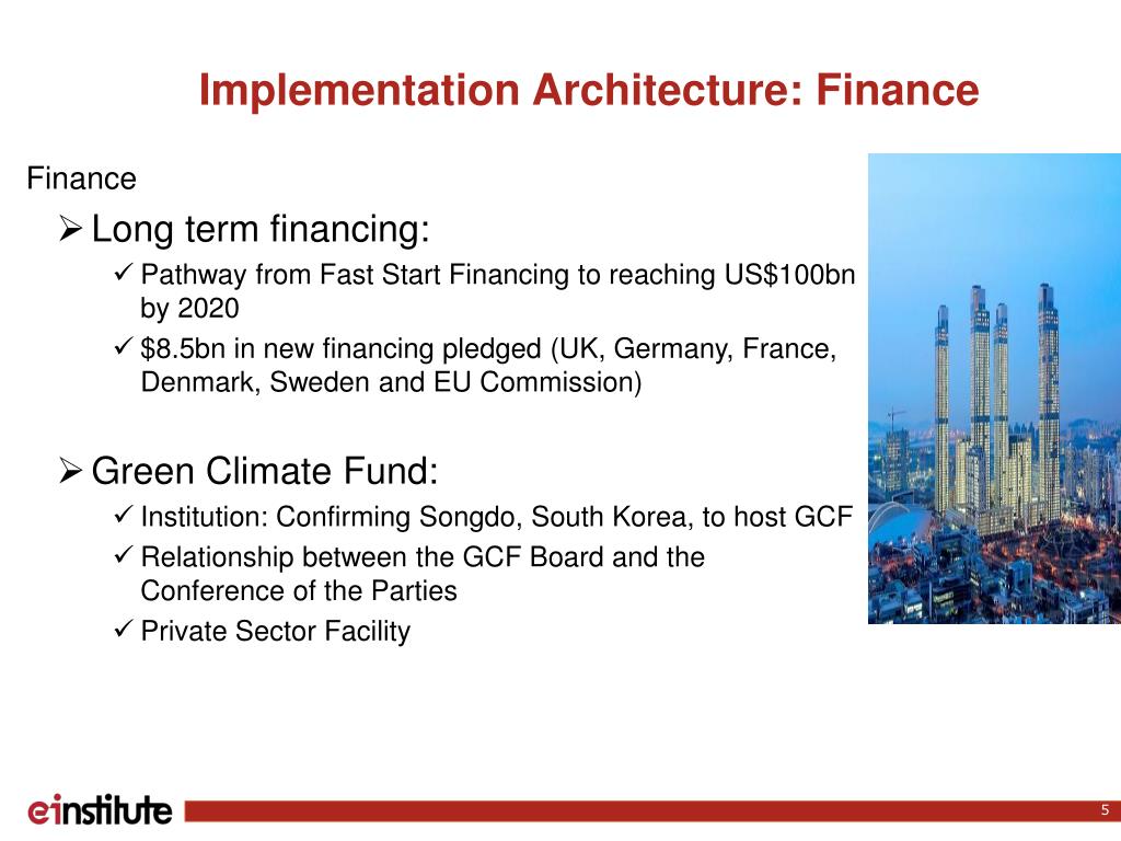 Implementation Architecture: Finance Finance • Long term financing: • Pathway from Fast Start Financing to reaching US$100bn by 2020 • $8.5bn in new financing pledged (UK, Germany, France, Denmark, Sweden and EU Commission) • Green Climate Fund: • Institution: Confirming Songdo, South Korea, to host GCF • Relationship between the GCF Board and the Conference of the Parties • Private Sector Facility