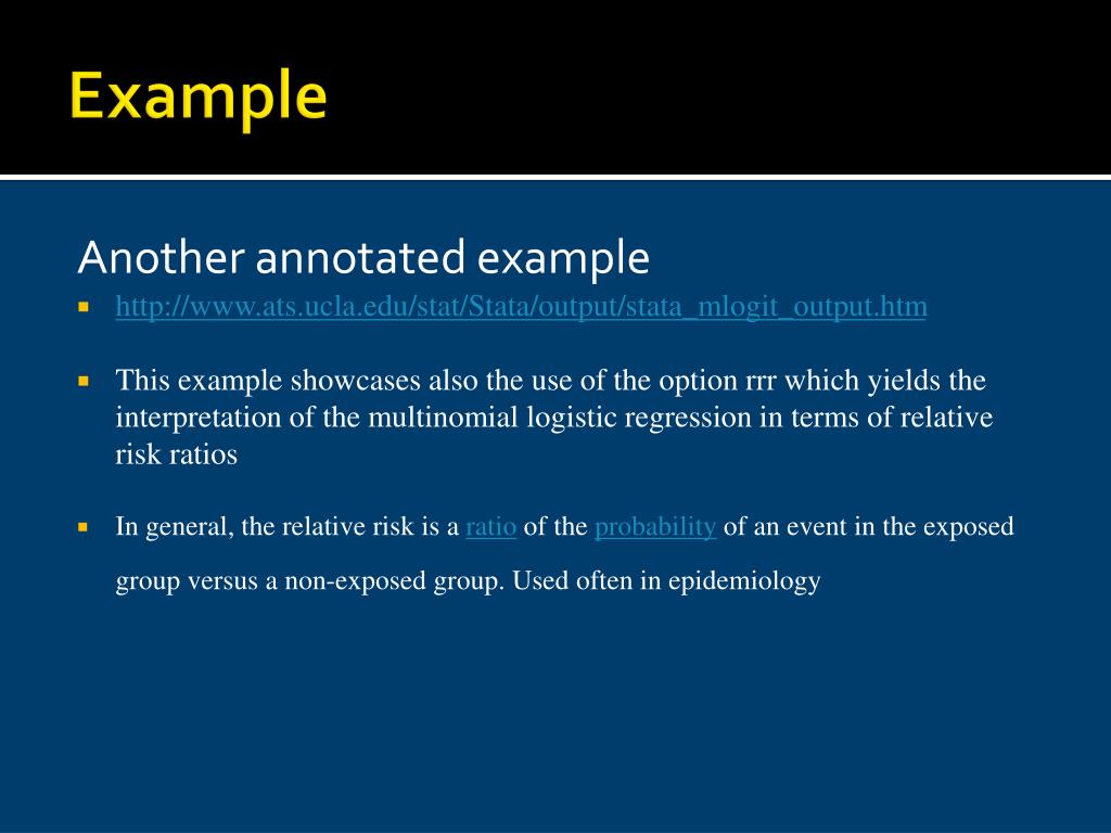 Example Another annotated example http://www.ats.ucla.edu/stat/Stata/output/stata_mlogit_output.htm This example showcases also the use of the option rrr which yields the interpretation of the multinomial logistic regression in terms of relative risk ratios In general, the relative risk is a ratio of the probability of an event in the exposed group versus a non-exposed group. Used often in epidemiology