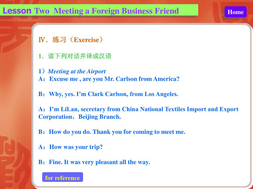 Lesson Two Meeting a Foreign Business Friend Home Ⅳ.练习(Exercise) 1.读下列对话并译成汉语 1)Meeting at the Airport A:Excuse me , are you Mr. Carlson from America? B:Why, yes. I’m Clark Carlson, from Los Angeles. A:I’m LiLan, secretary from China National Textiles Import and Export Corporation,Beijing Branch. B:How do you do. Thank you for coming to meet me. A:How was your trip? B:Fine. It was very pleasant all the way. for reference