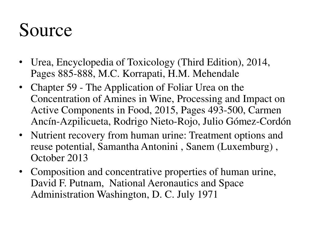 Source • Urea, Encyclopedia of Toxicology (ThirdEdition), 2014, Pages 885-888, M.C. Korrapati, H.M. Mehendale • Chapter 59 - TheApplication of Foliar Urea ontheConcentration of Amines in Wine, Processing and Impacton Active Components in Food, 2015, Pages 493-500, Carmen Ancín-Azpilicueta, Rodrigo Nieto-Rojo, Julio Gómez-Cordón • Nutrient recovery from human urine: Treatment options and reuse potential, Samantha Antonini , Sanem (Luxemburg) , October 2013 • Composition and concentrative properties of human urine, David F. Putnam, National Aeronautics and Space Administration Washington, D. C. July 1971