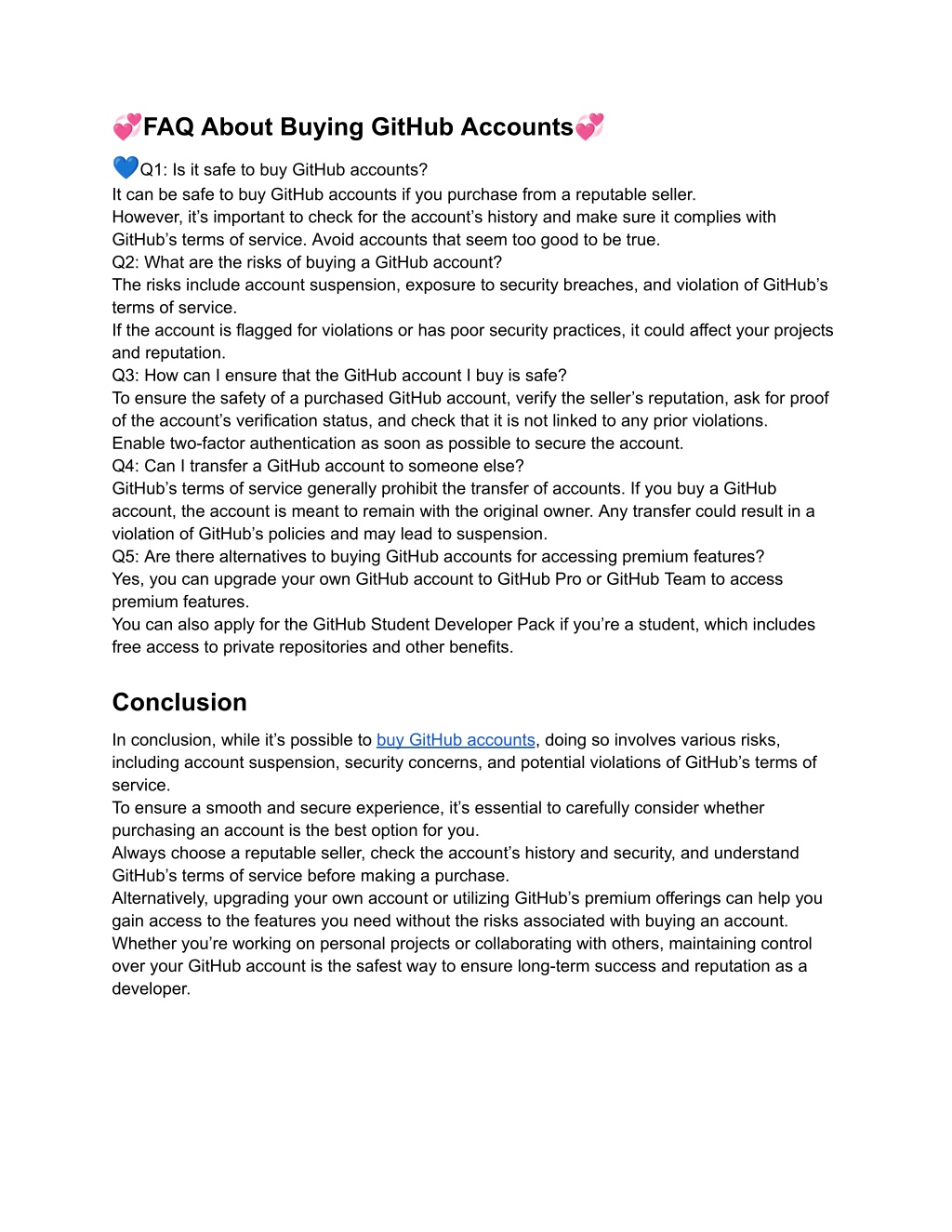 8. ?FAQ About Buying GitHub Accounts? ?Q1: Is it safe to buy GitHub accounts? It can be safe to buy GitHub accounts if you purchase from a reputable seller. However, it’s important to check for the account’s history and make sure it complies with GitHub’s terms of service. Avoid accounts that seem too good to be true. Q2: What are the risks of buying a GitHub account? The risks include account suspension, exposure to security breaches, and violation of GitHub’s terms of service. If the account is flagged for violations or has poor security practices, it could affect your projects and reputation. Q3: How can I ensure that the GitHub account I buy is safe? To ensure the safety of a purchased GitHub account, verify the seller’s reputation, ask for proof of the account’s verification status, and check that it is not linked to any prior violations. Enable two-factor authentication as soon as possible to secure the account. Q4: Can I transfer a GitHub account to someone else? GitHub’s terms of service generally prohibit the transfer of accounts. If you buy a GitHub account, the account is meant to remain with the original owner. Any transfer could result in a violation of GitHub’s policies and may lead to suspension. Q5: Are there alternatives to buying GitHub accounts for accessing premium features? Yes, you can upgrade your own GitHub account to GitHub Pro or GitHub Team to access premium features. You can also apply for the GitHub Student Developer Pack if you’re a student, which includes free access to private repositories and other benefits. Conclusion In conclusion, while it’s possible to buy GitHub accounts, doing so involves various risks, including account suspension, security concerns, and potential violations of GitHub’s terms of service. To ensure a smooth and secure experience, it’s essential to carefully consider whether purchasing an account is the best option for you. Always choose a reputable seller, check the account’s history and security, and understand GitHub’s terms of service before making a purchase. Alternatively, upgrading your own account or utilizing GitHub’s premium offerings can help you gain access to the features you need without the risks associated with buying an account. Whether you’re working on personal projects or collaborating with others, maintaining control over your GitHub account is the safest way to ensure long-term success and reputation as a developer.