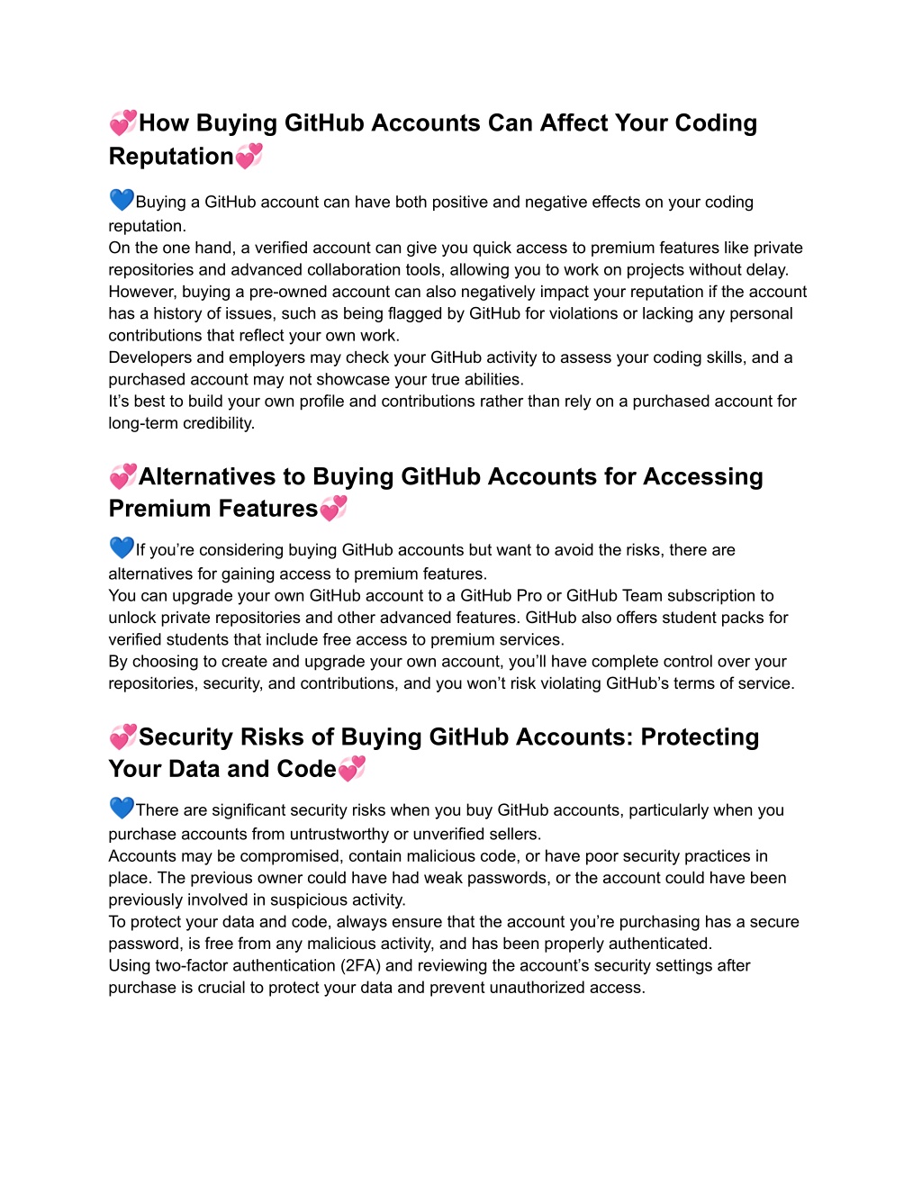 7. ?How Buying GitHub Accounts Can Affect Your Coding Reputation? ?Buying a GitHub account can have both positive and negative effects on your coding reputation. On the one hand, a verified account can give you quick access to premium features like private repositories and advanced collaboration tools, allowing you to work on projects without delay. However, buying a pre-owned account can also negatively impact your reputation if the account has a history of issues, such as being flagged by GitHub for violations or lacking any personal contributions that reflect your own work. Developers and employers may check your GitHub activity to assess your coding skills, and a purchased account may not showcase your true abilities. It’s best to build your own profile and contributions rather than rely on a purchased account for long-term credibility. ?Alternatives to Buying GitHub Accounts for Accessing Premium Features? ?If you’re considering buying GitHub accounts but want to avoid the risks, there are alternatives for gaining access to premium features. You can upgrade your own GitHub account to a GitHub Pro or GitHub Team subscription to unlock private repositories and other advanced features. GitHub also offers student packs for verified students that include free access to premium services. By choosing to create and upgrade your own account, you’ll have complete control over your repositories, security, and contributions, and you won’t risk violating GitHub’s terms of service. ?Security Risks of Buying GitHub Accounts: Protecting Your Data and Code? ?There are significant security risks when you buy GitHub accounts, particularly when you purchase accounts from untrustworthy or unverified sellers. Accounts may be compromised, contain malicious code, or have poor security practices in place. The previous owner could have had weak passwords, or the account could have been previously involved in suspicious activity. To protect your data and code, always ensure that the account you’re purchasing has a secure password, is free from any malicious activity, and has been properly authenticated. Using two-factor authentication (2FA) and reviewing the account’s security settings after purchase is crucial to protect your data and prevent unauthorized access.