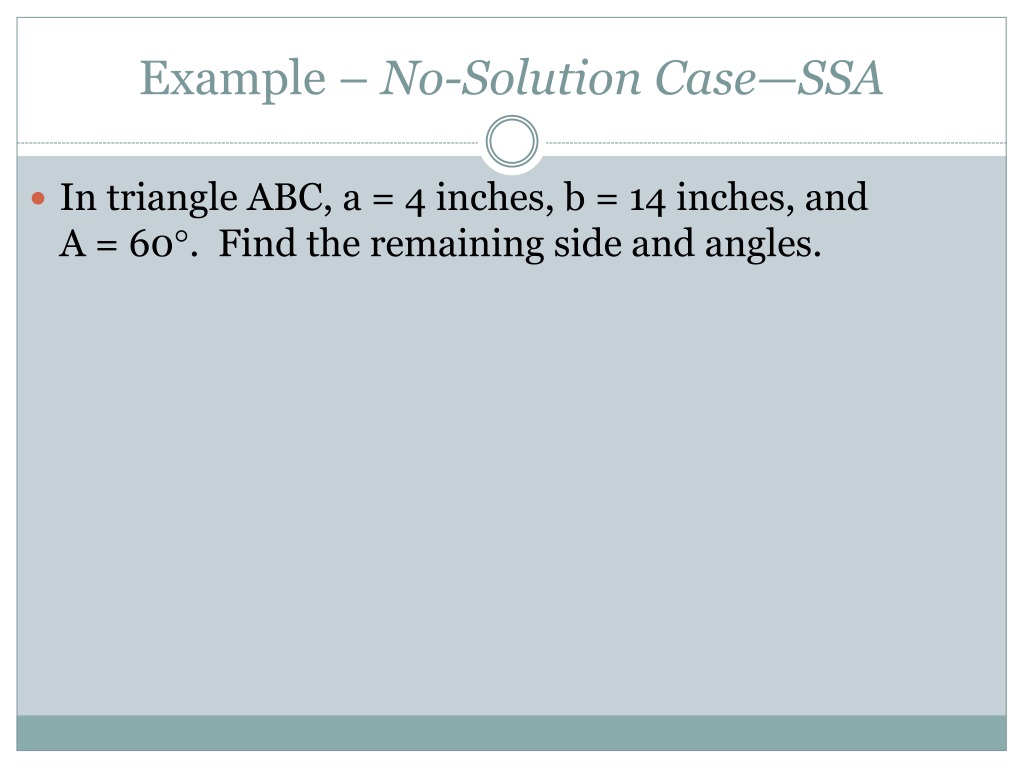 Example – No-Solution Case—SSA In triangle ABC, a = 4 inches, b = 14 inches, and A = 60. Find the remaining side and angles.