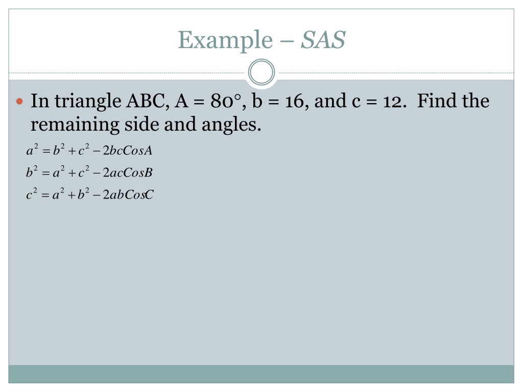 Example – SAS In triangle ABC, A = 80, b = 16, and c = 12. Find the remaining side and angles.